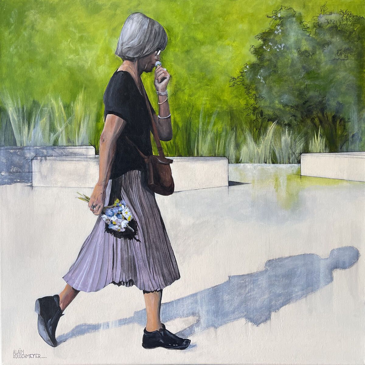 Her shadow stretched before her like the little girl she had been and who loved above all to offer her mother a bouquet of wild flowers that she picked in the meadow around the house. From now on she preferred to leave nature untouched, except that morning when on the path leading to the village square, this childhood memory came back to her at the sight of a large mauve carpet spotted with pale pink and bright yellow and waving in the breeze. So she had carefully picked a few strands, now gathered in one hand while the other held a field cockle whose fresh spring scent she breathed in with nostalgia.