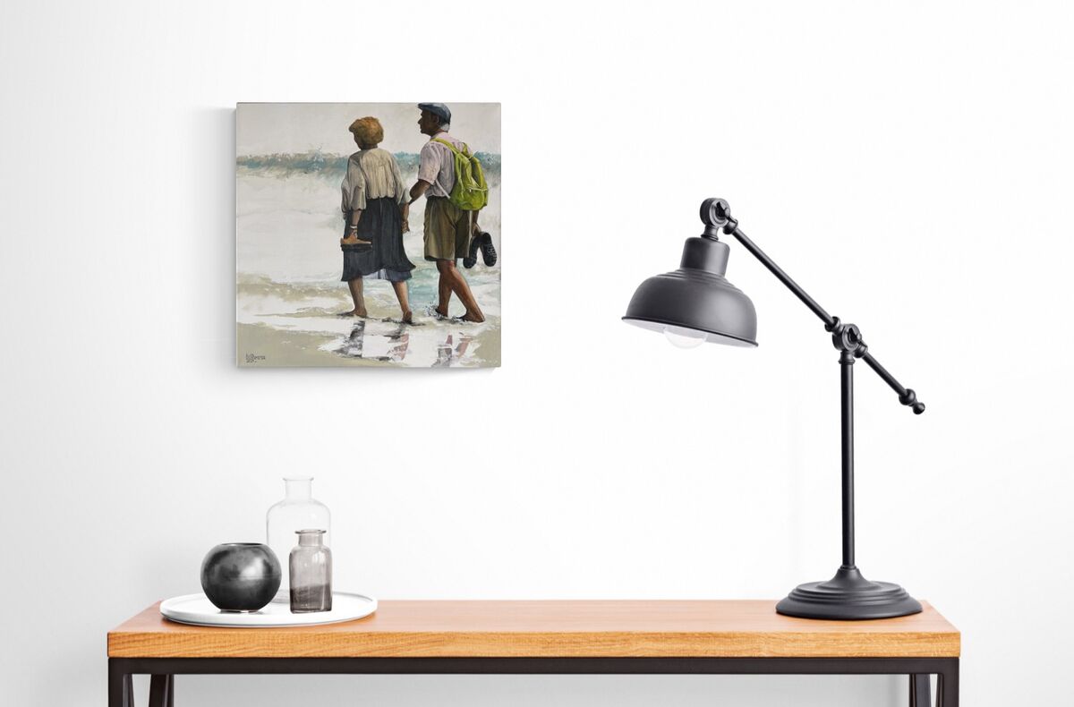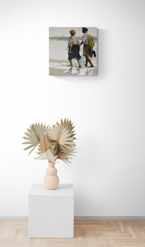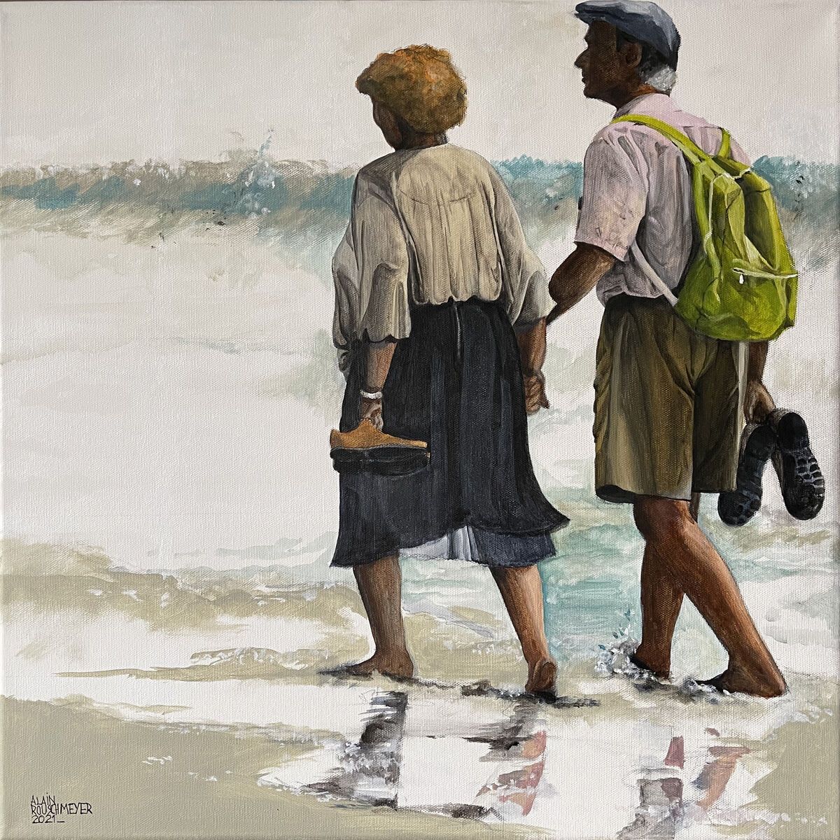 HAND IN HAND The day was ending, the setting sun from the seaside gave the landscape a pleasant softness and luminosity punctuated by the movement of the waves. The old couple in love walked along the water's edge, bare feet splashed with foam and hand in hand as on the first day.